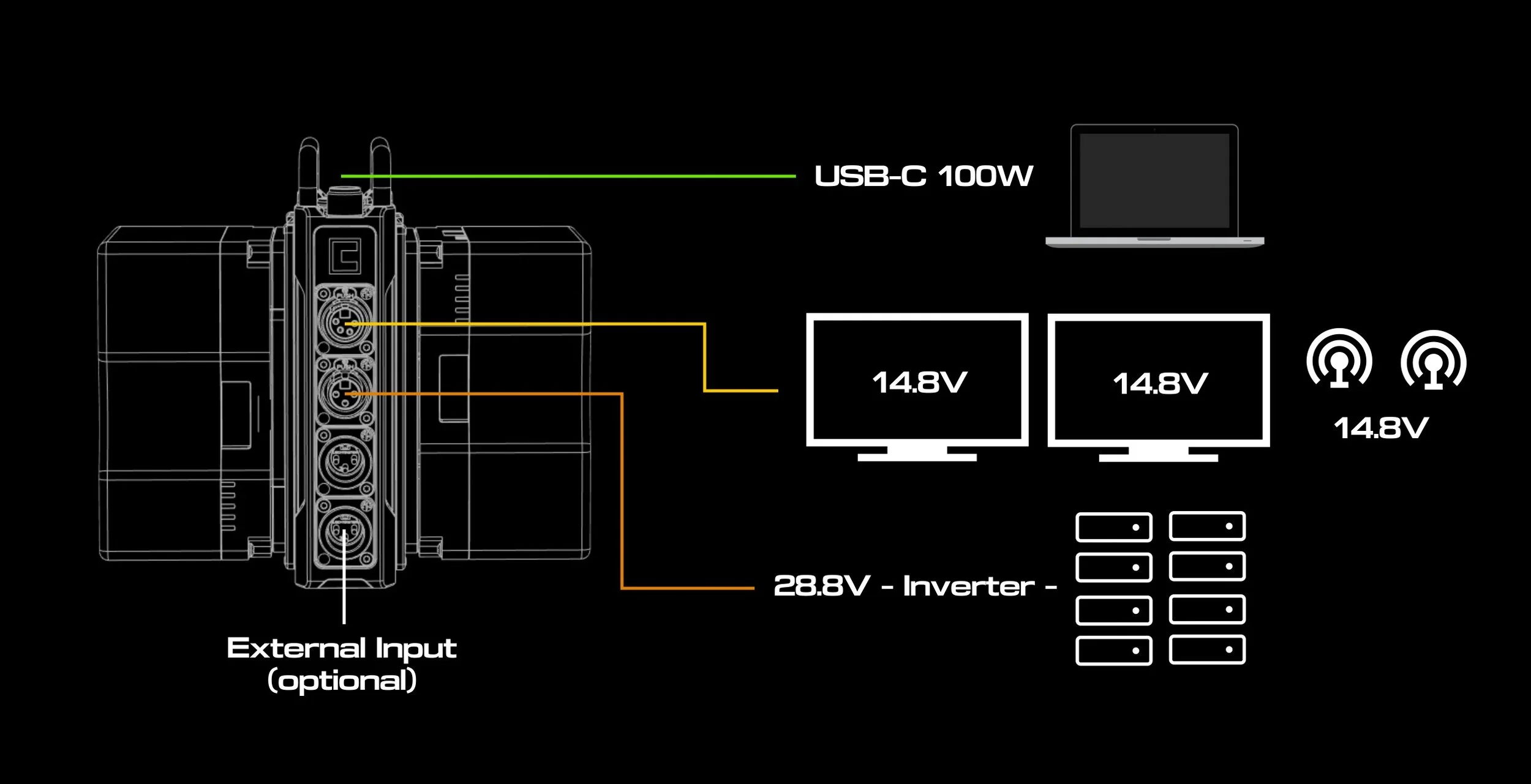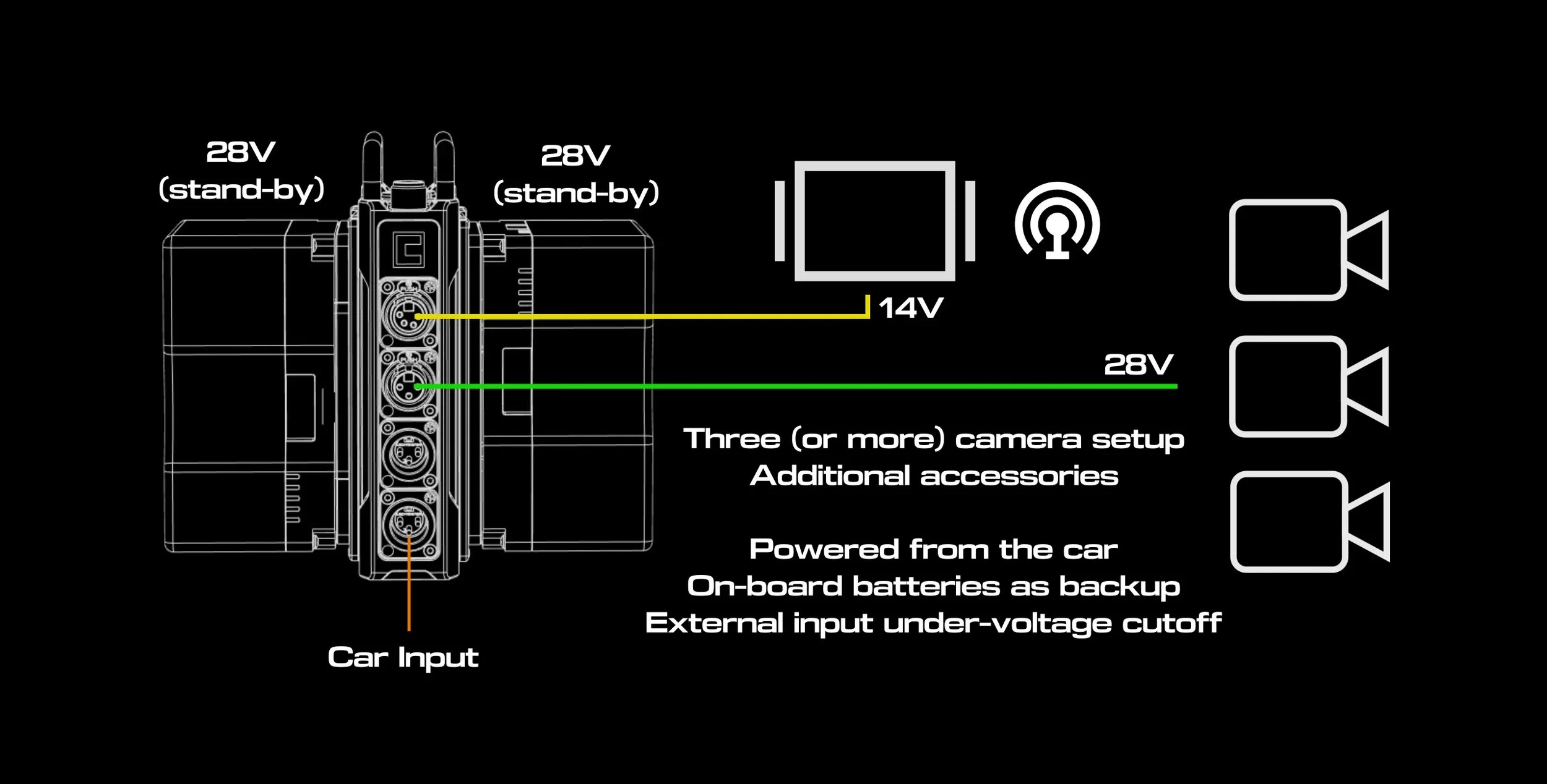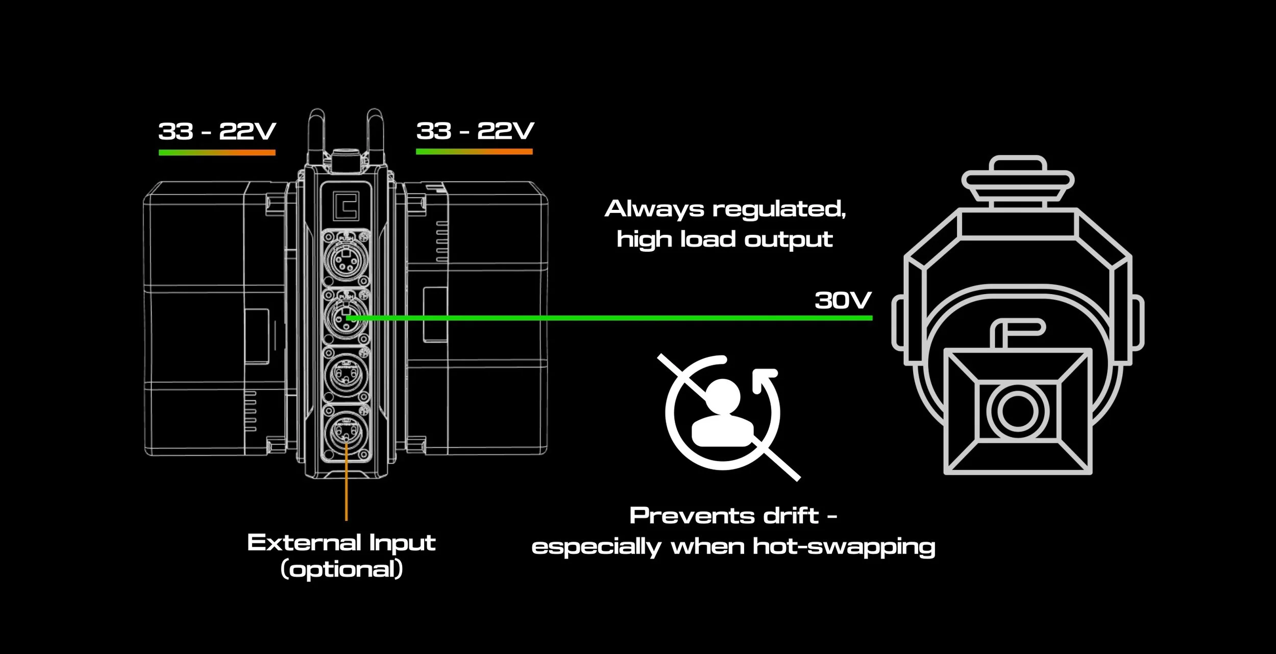 Up to three battery inputs working in parallel provide unprecedented output capabilities. 10 – 34VDC – up to 20A per channel.